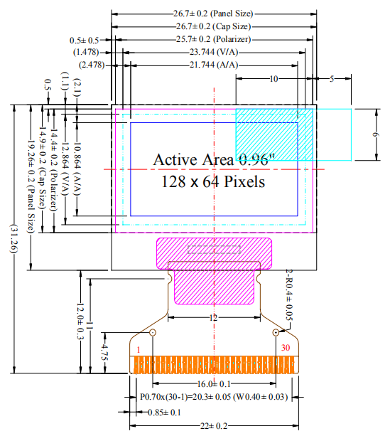 0.96 Inch OLED Module Resolution 128*64P OLED Display Module SPI12C SSD1306 30pin White Blue